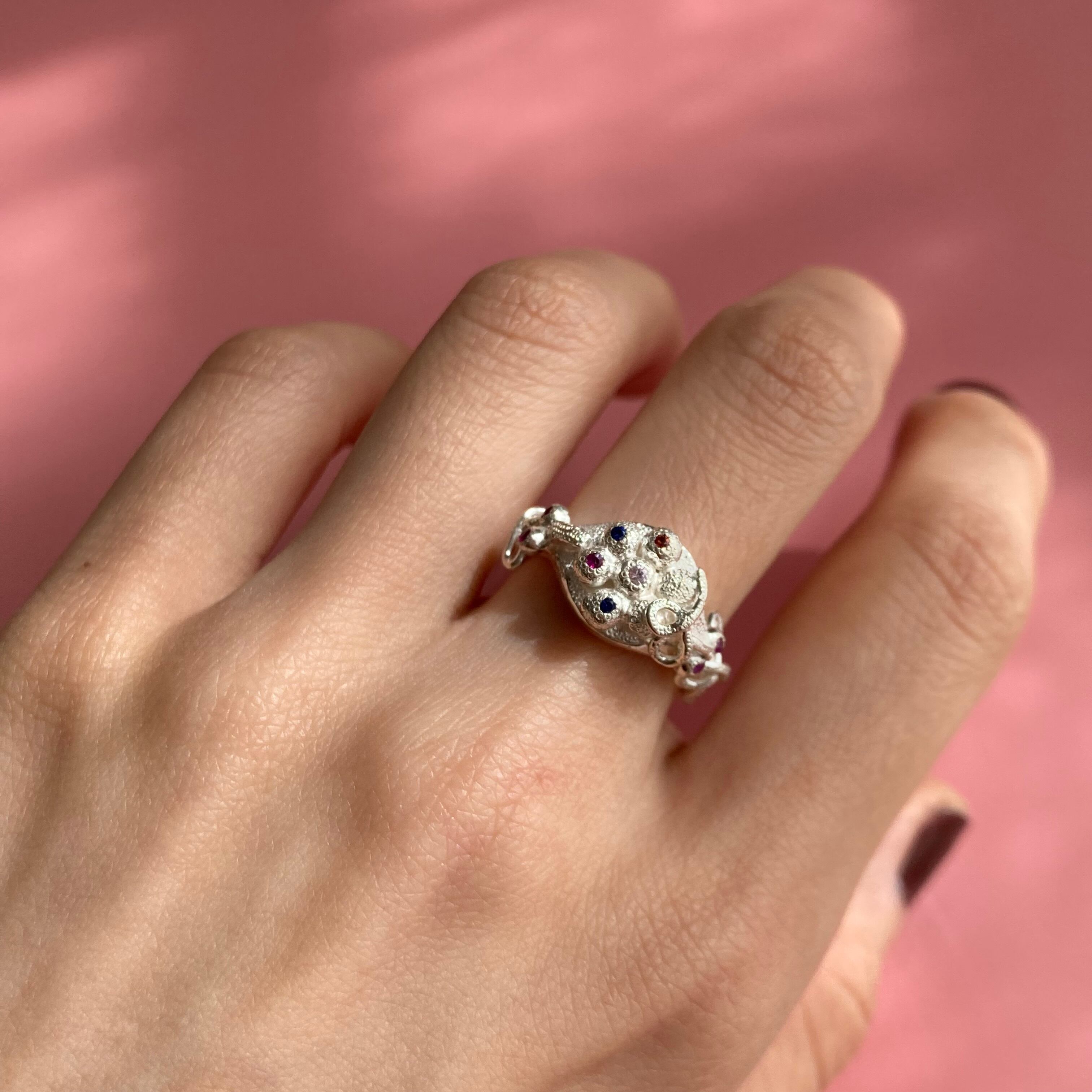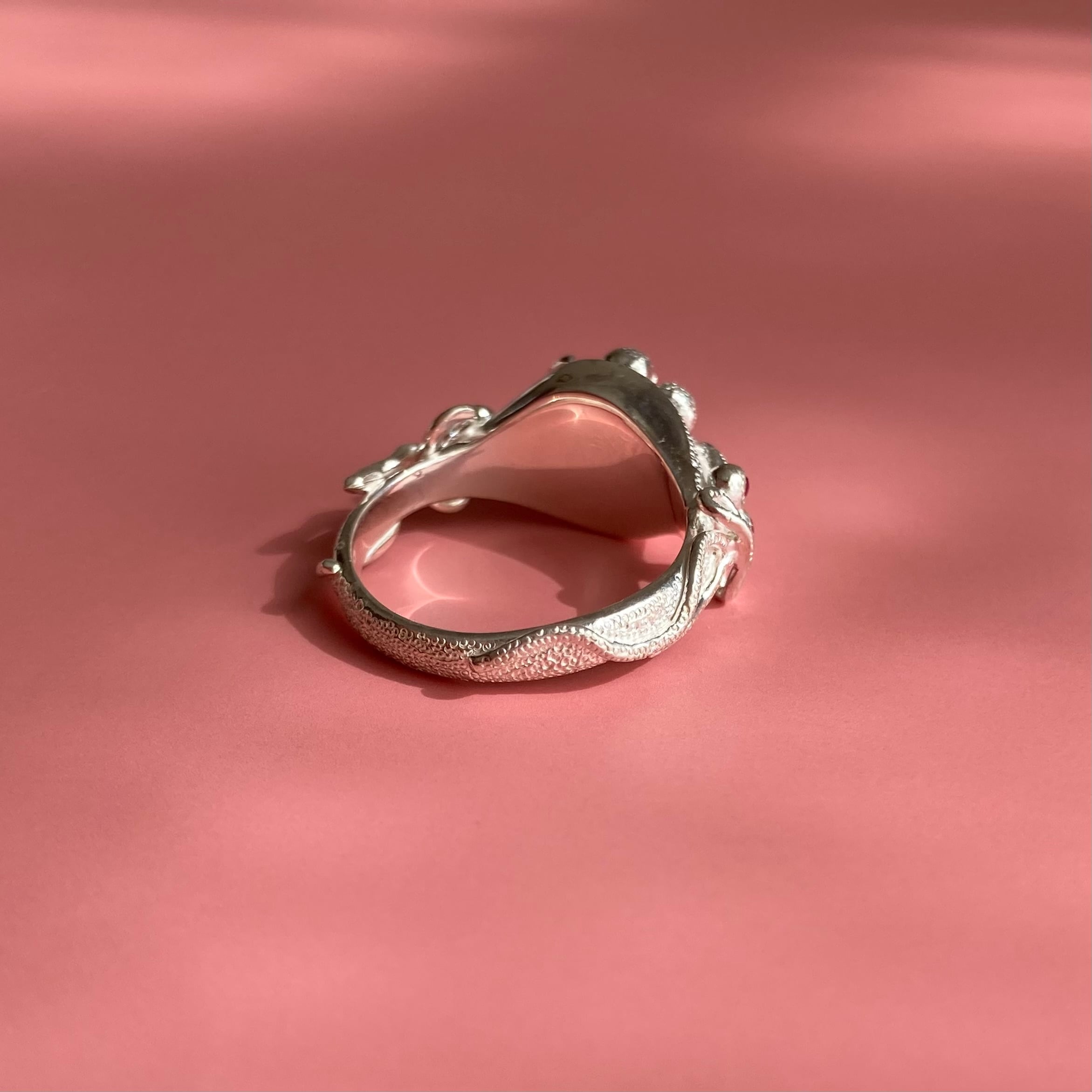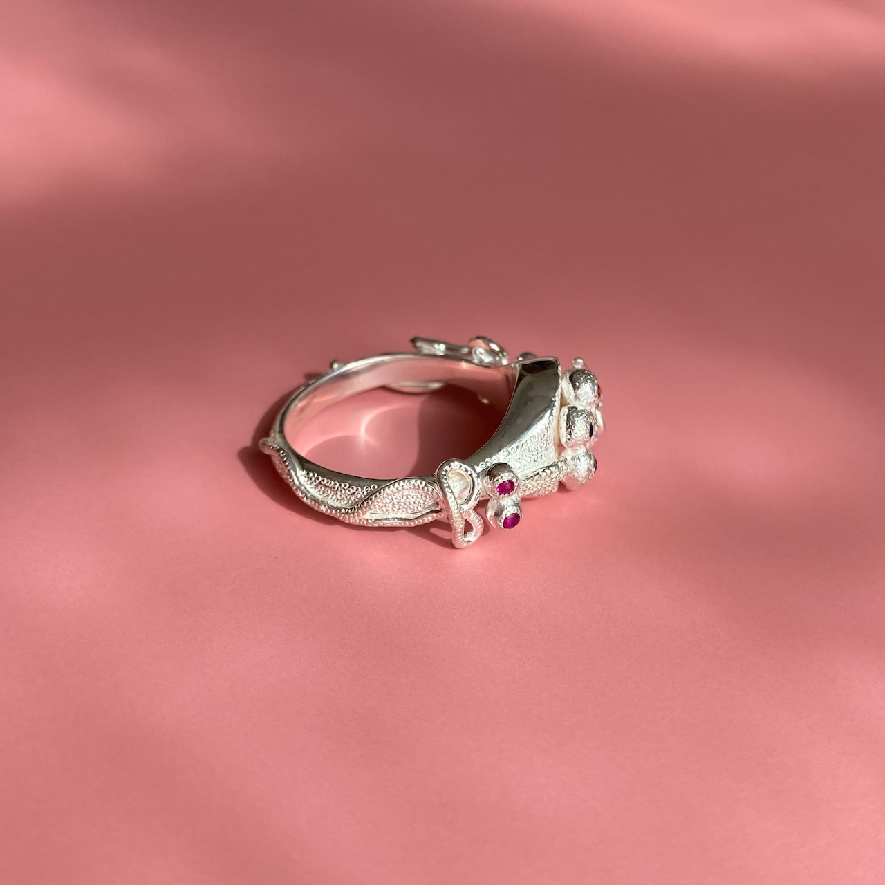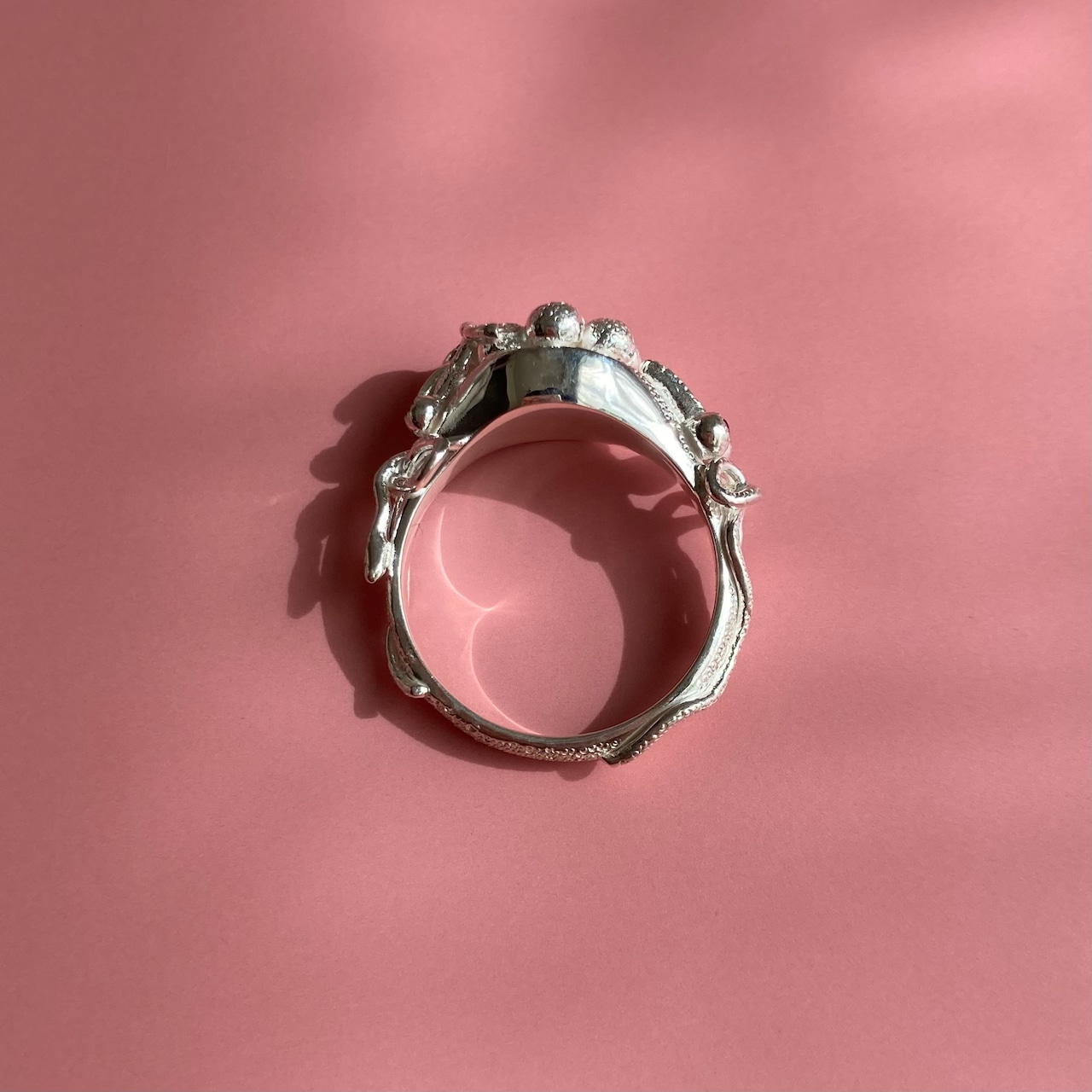 おまじないシリーズの中でも一際華やかで目を引くリング。土台のリングは他のものと同じですが、パーツとなる部分は1つずつロウ付けしました。魔法が使えるコンパクトのようなリング。