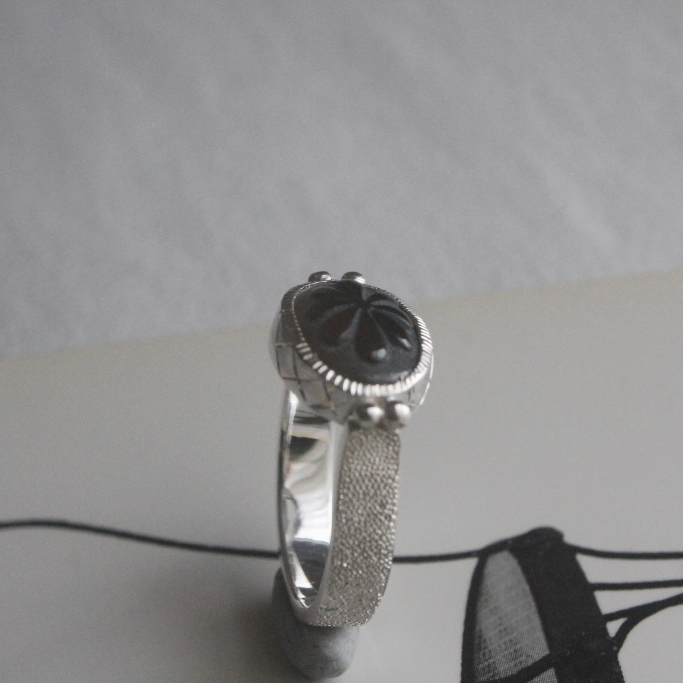 カービングを施されたスモーキークォーツシェルがステキ。スモーキークォーツシェルとは、シェル(白蝶貝)の上にクォーツを重ねて出来上がった石です。