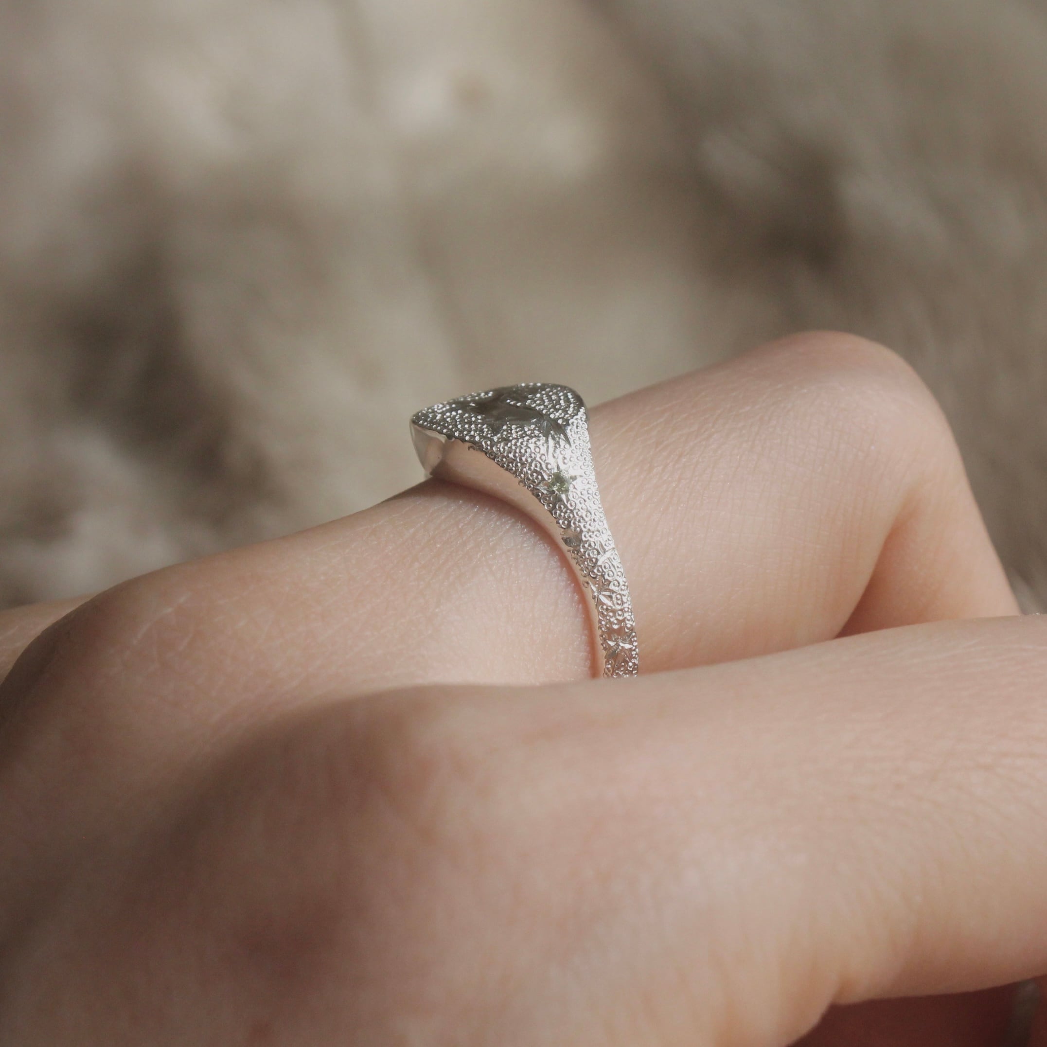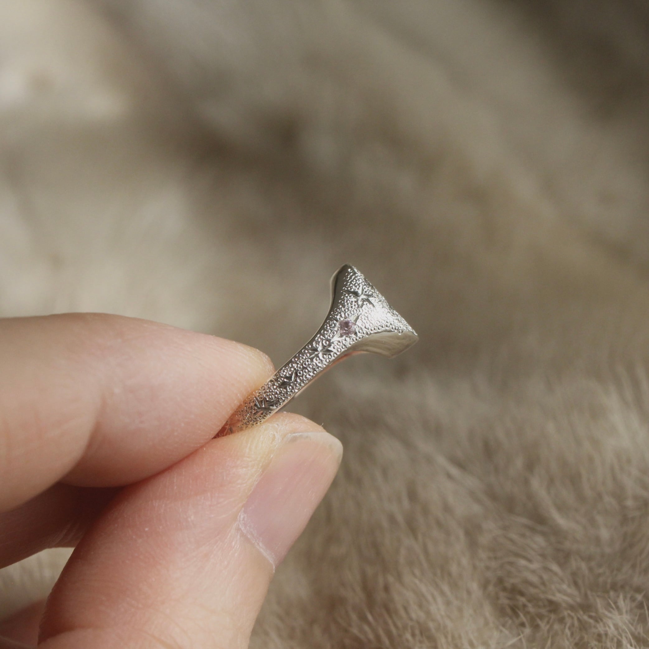 左右にピンクサファイアとペリドットを一粒ずつ留めました。昔からピンクと黄緑色の組み合わせが好きです。