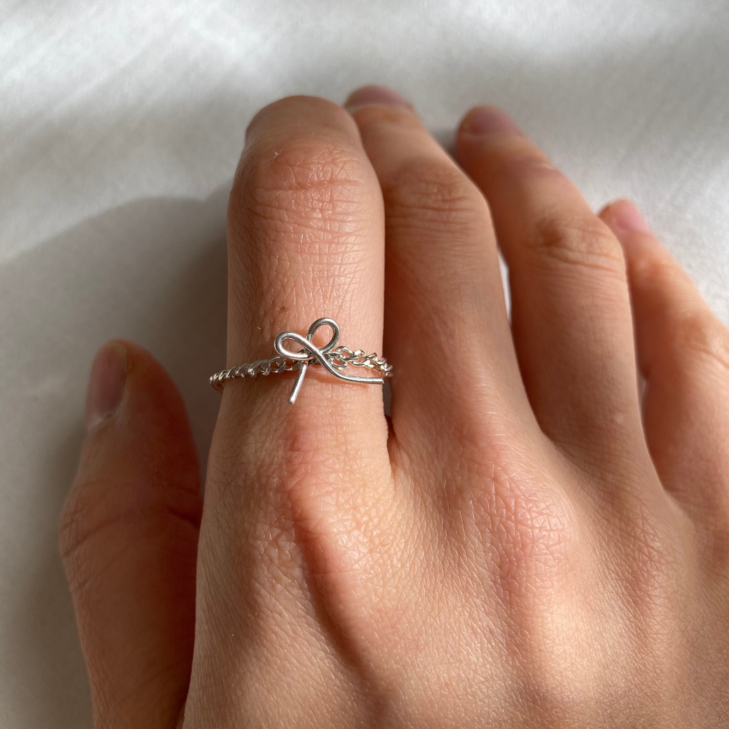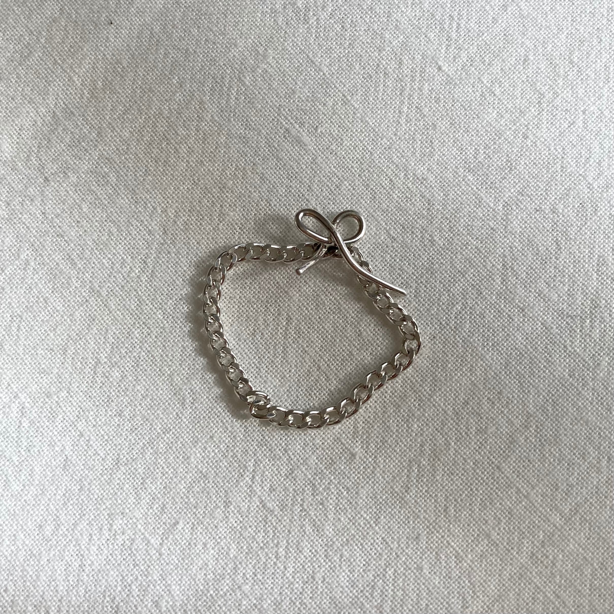 一個ずつ形の違うりぼんをつけたチェーンリング。 繊細な作りなので優しく取り扱ってください。 素材:シルバー925