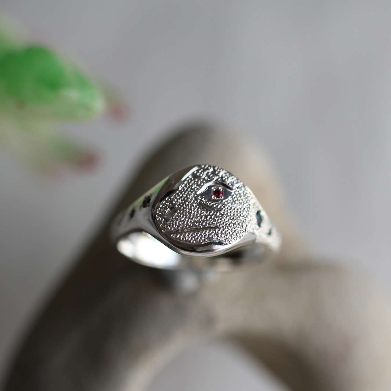 顔が正面に、胴体がリング腕部分に、尻尾が正面から見て左へとつながるデザインのリング。